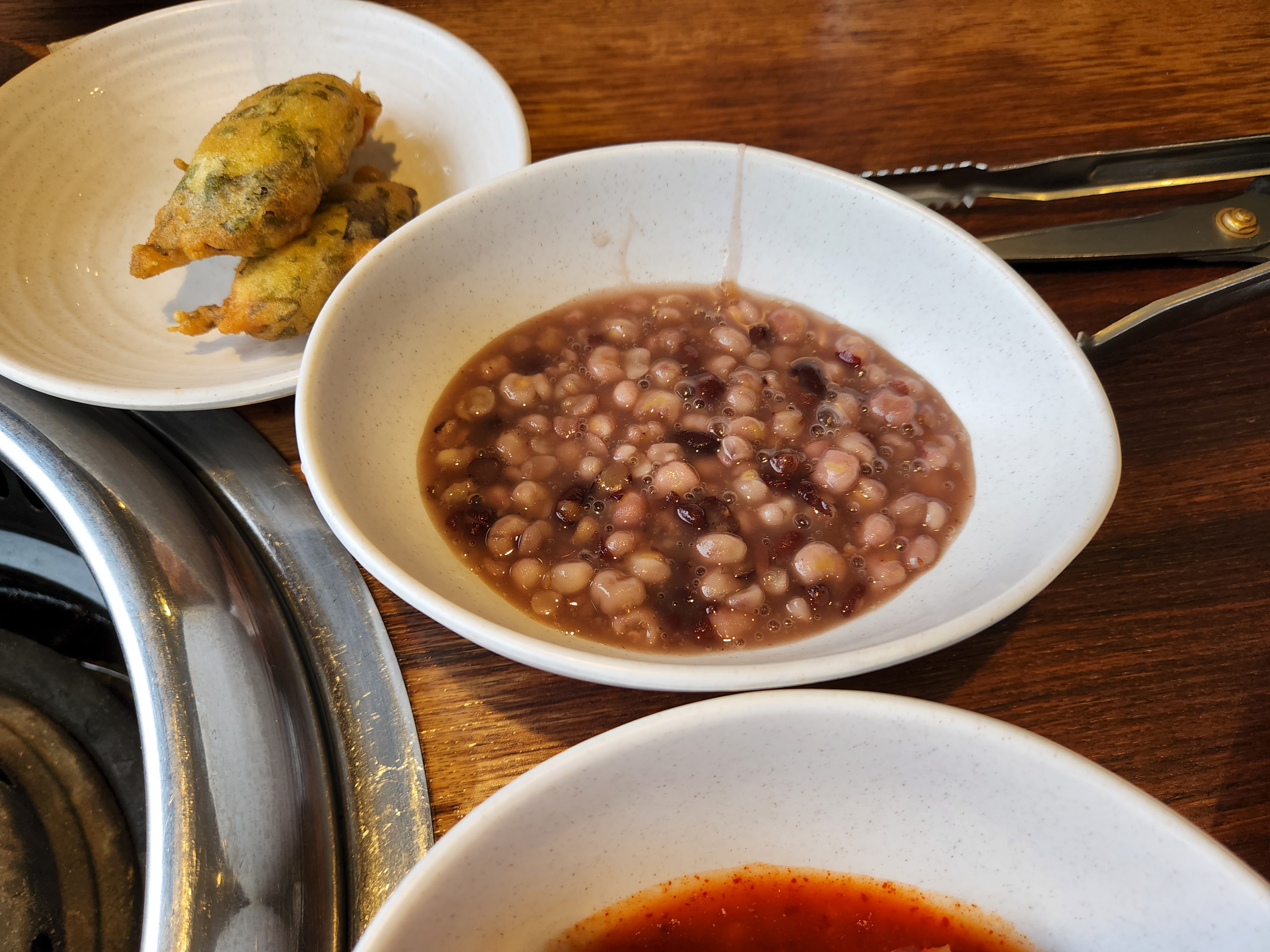 낫또와 같이 생긴 끈적끈적한 반찬은 '옥수수 범벅'이라고 한다. 많이 달지도 않고 먹을만 하다.