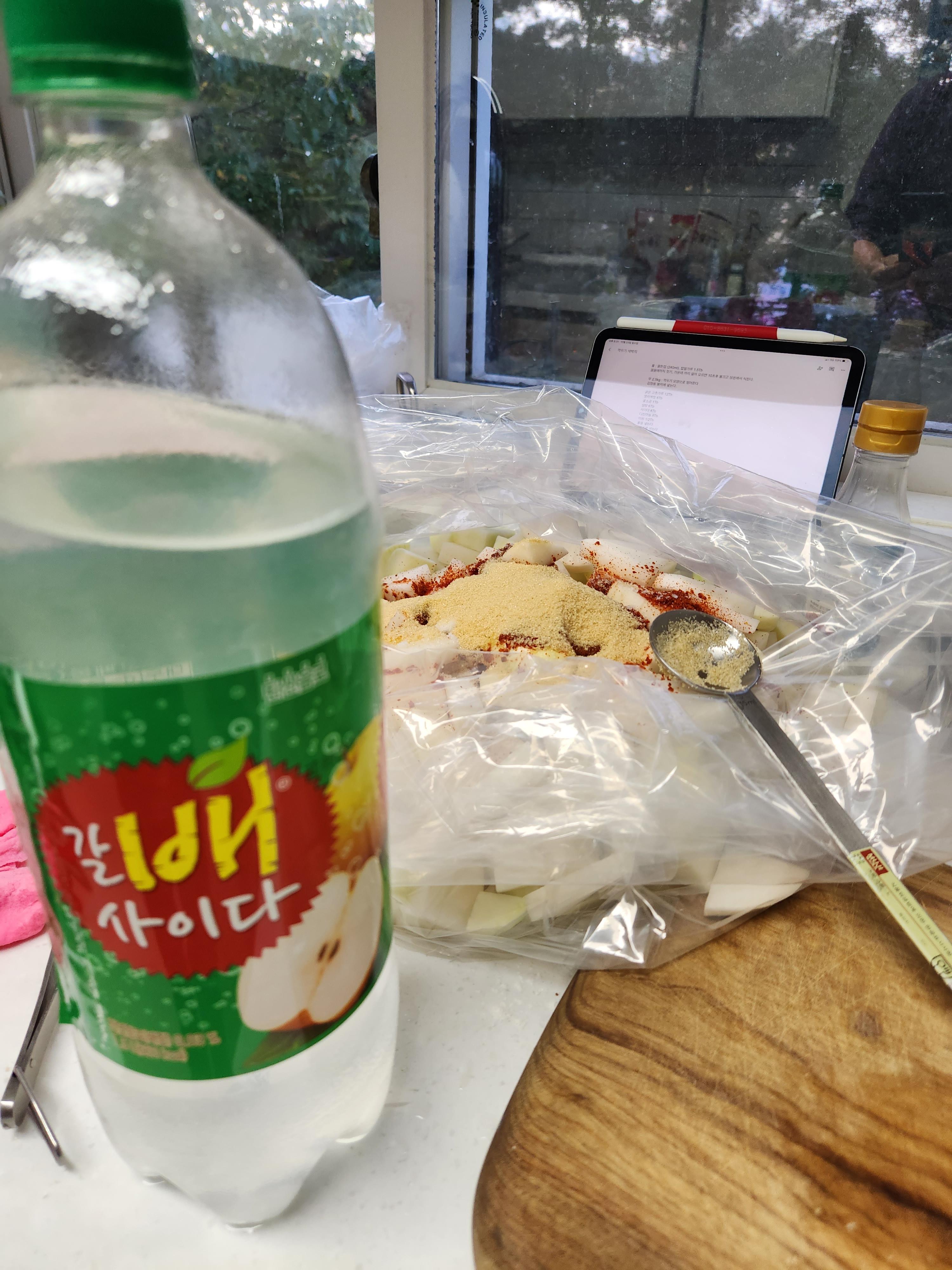 사이다를 넣으라는 얘기가 있었는데 왠지 배맛 사이다를 넣으면 더 맛있을것 같아서 배맛사이다를 넣었다.