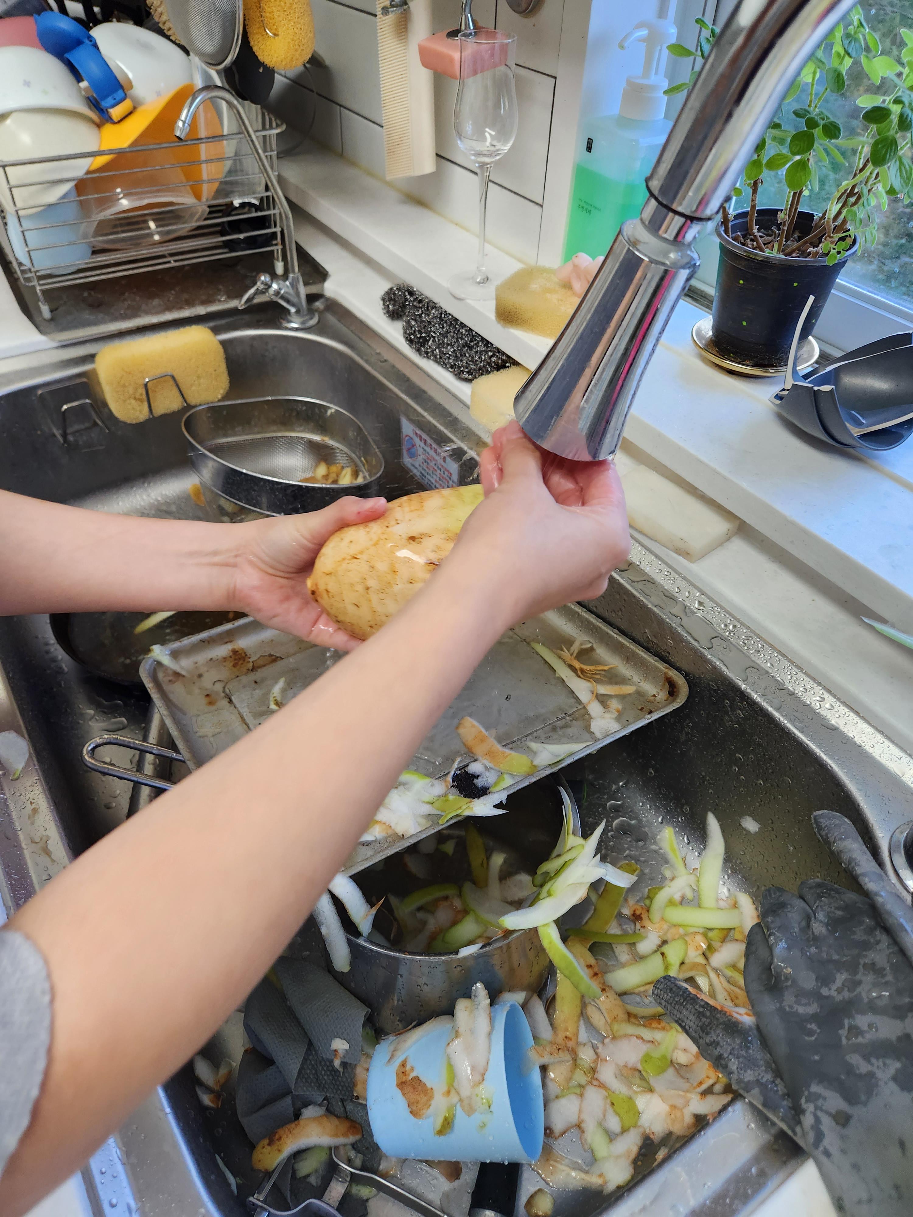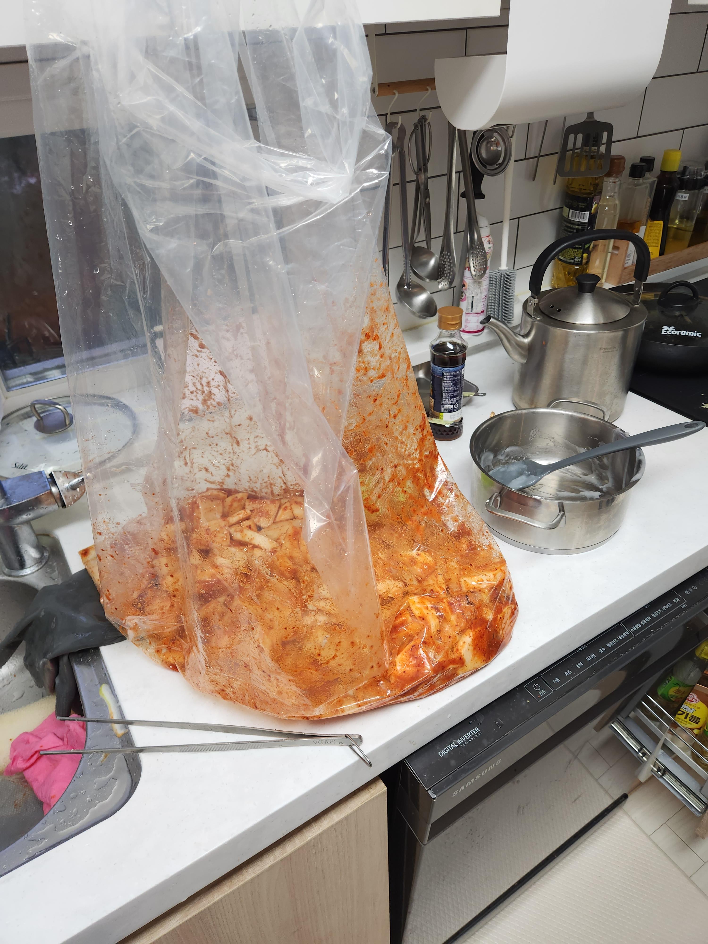 장갑을 끼우고 버무렸지만 손에 묻는건 어쩔수가 없다.