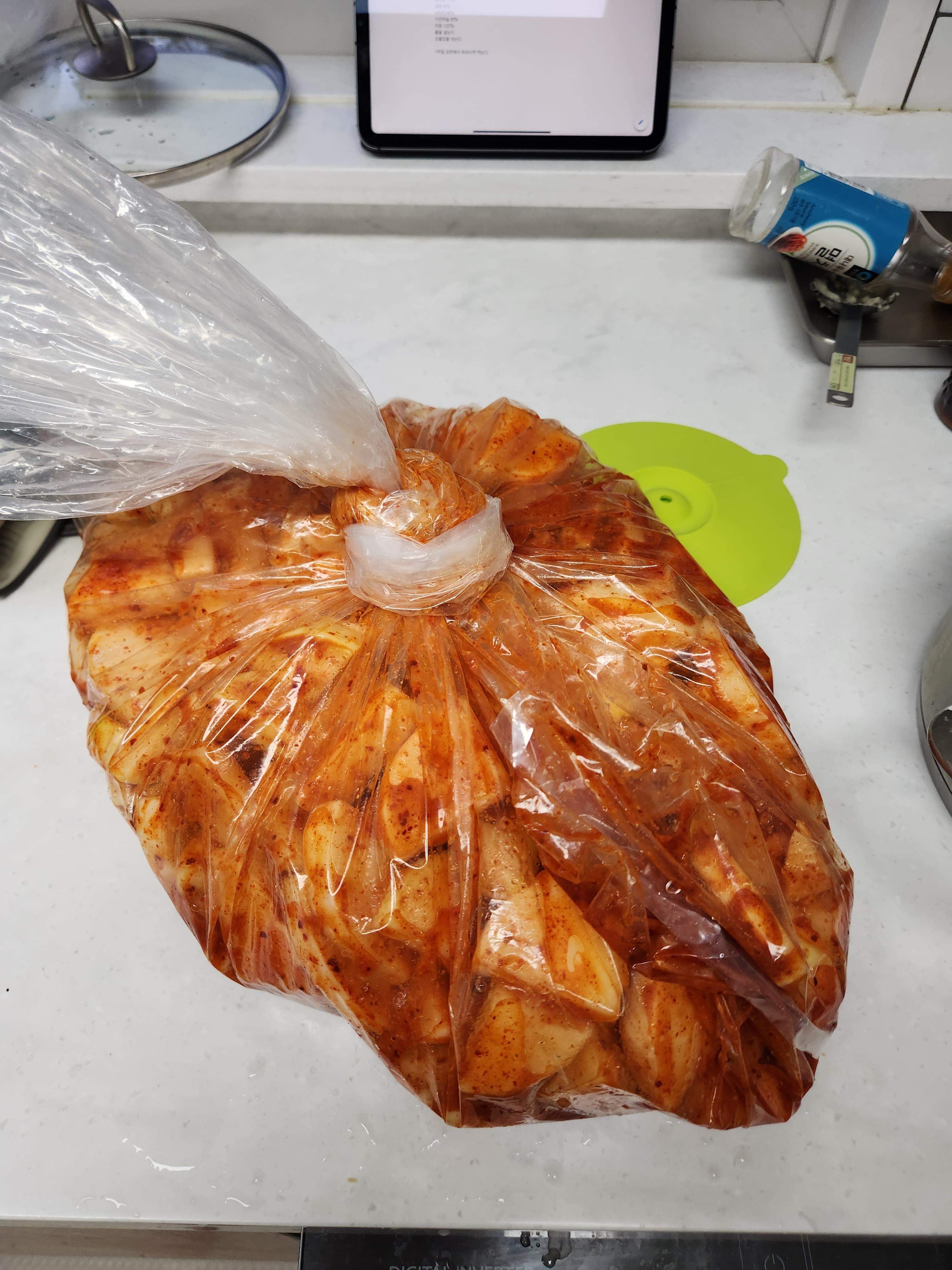 잘 버무린 깍두기를 꽁꽁 싸맨 다음에 이리저리 굴려주며 양념을 더 섞었다.
