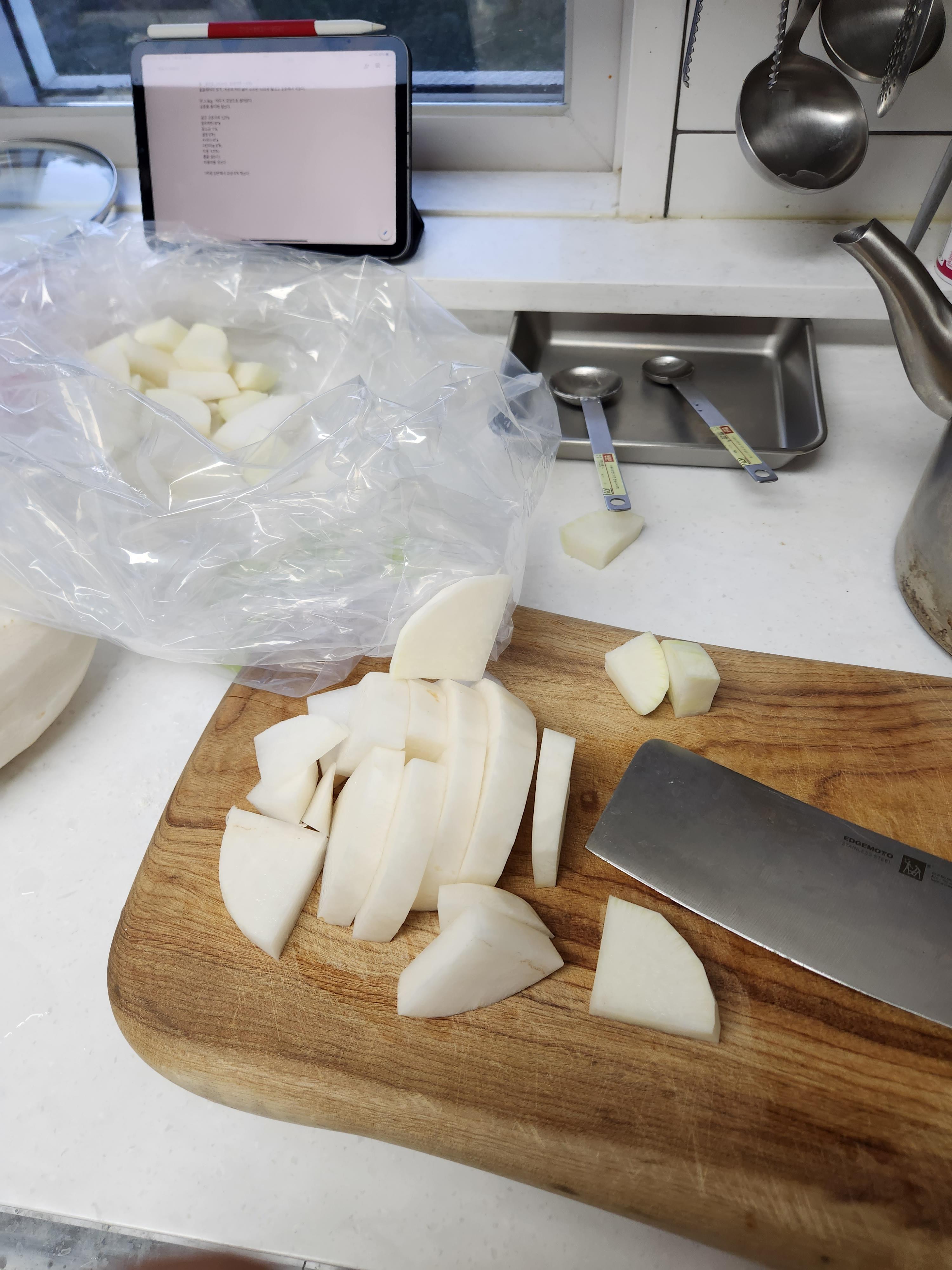 처음에는 잘 안섞이는것 같다니 이내 금방 풀처럼 변했다. 일단 만들어둔것은 상온에서 식히고 무를 손질하도록 한다.