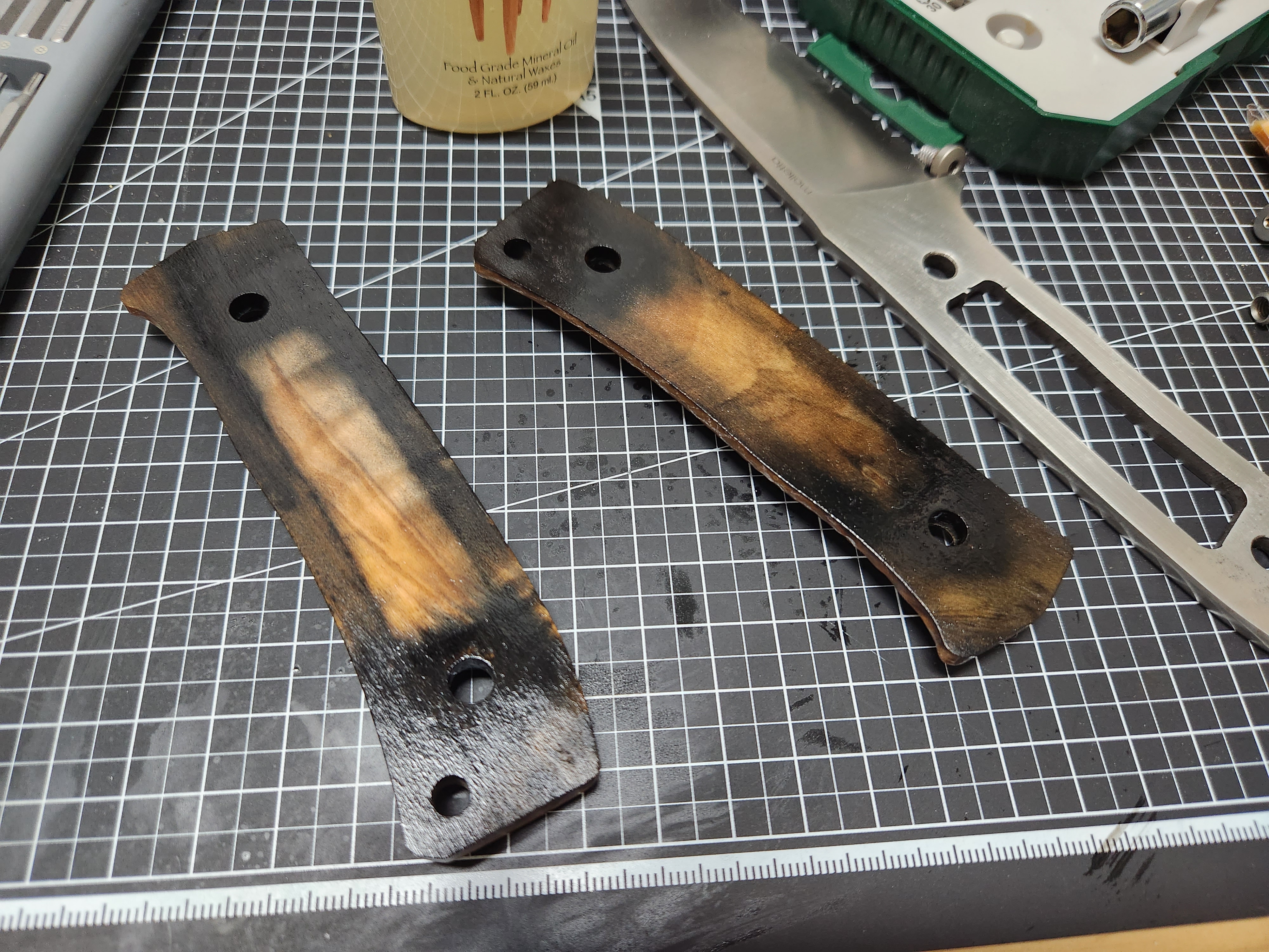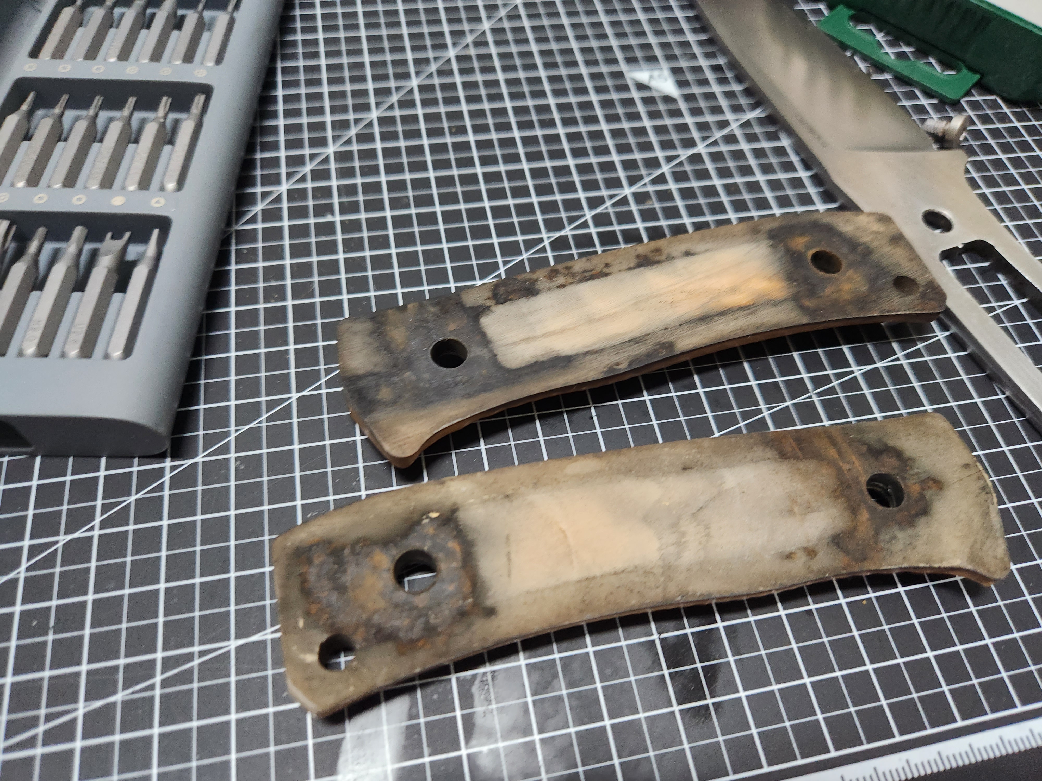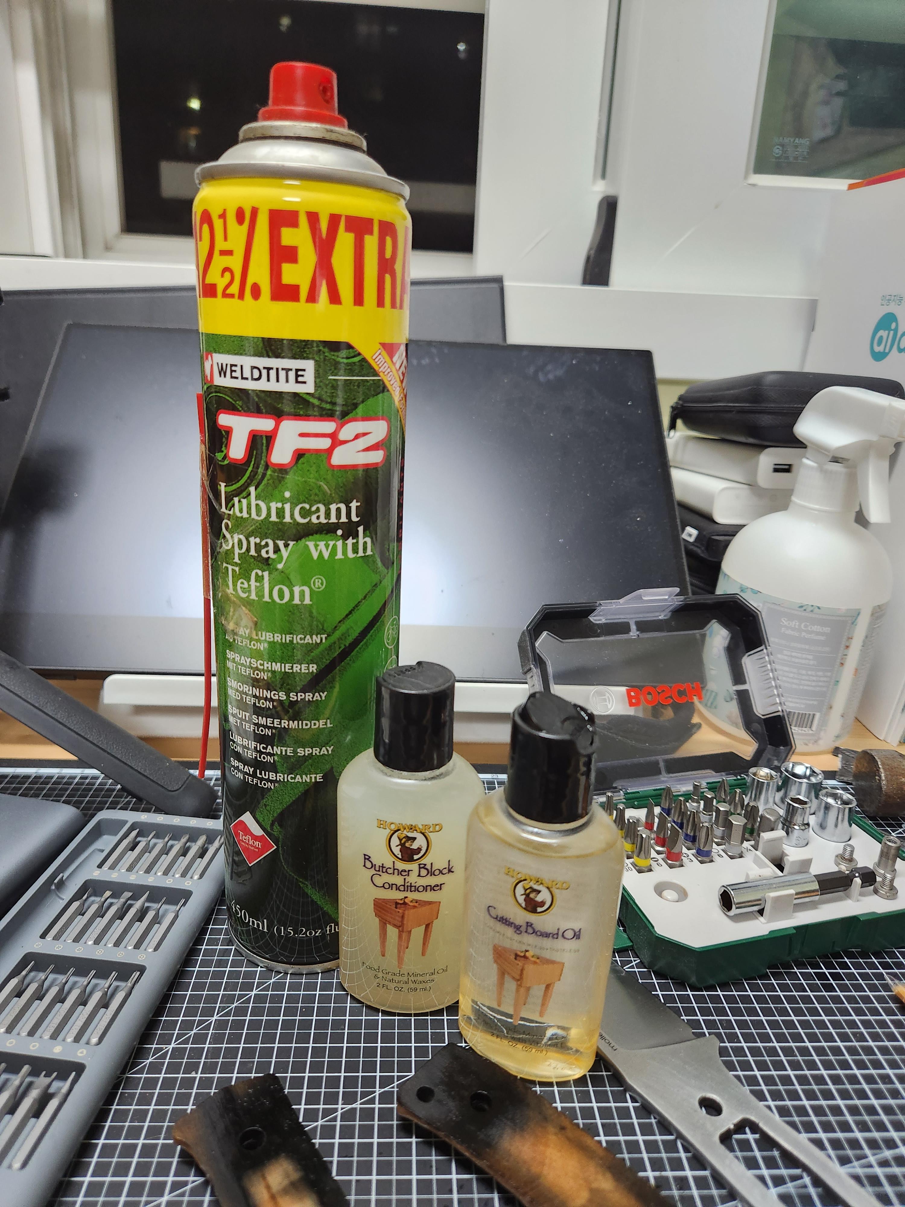 칼 본체에 생긴 녹은 테프론을 이용하여 닦아내고, 나무 손잡이는 부처블락 오일을 이용하여 코팅해 주었다.