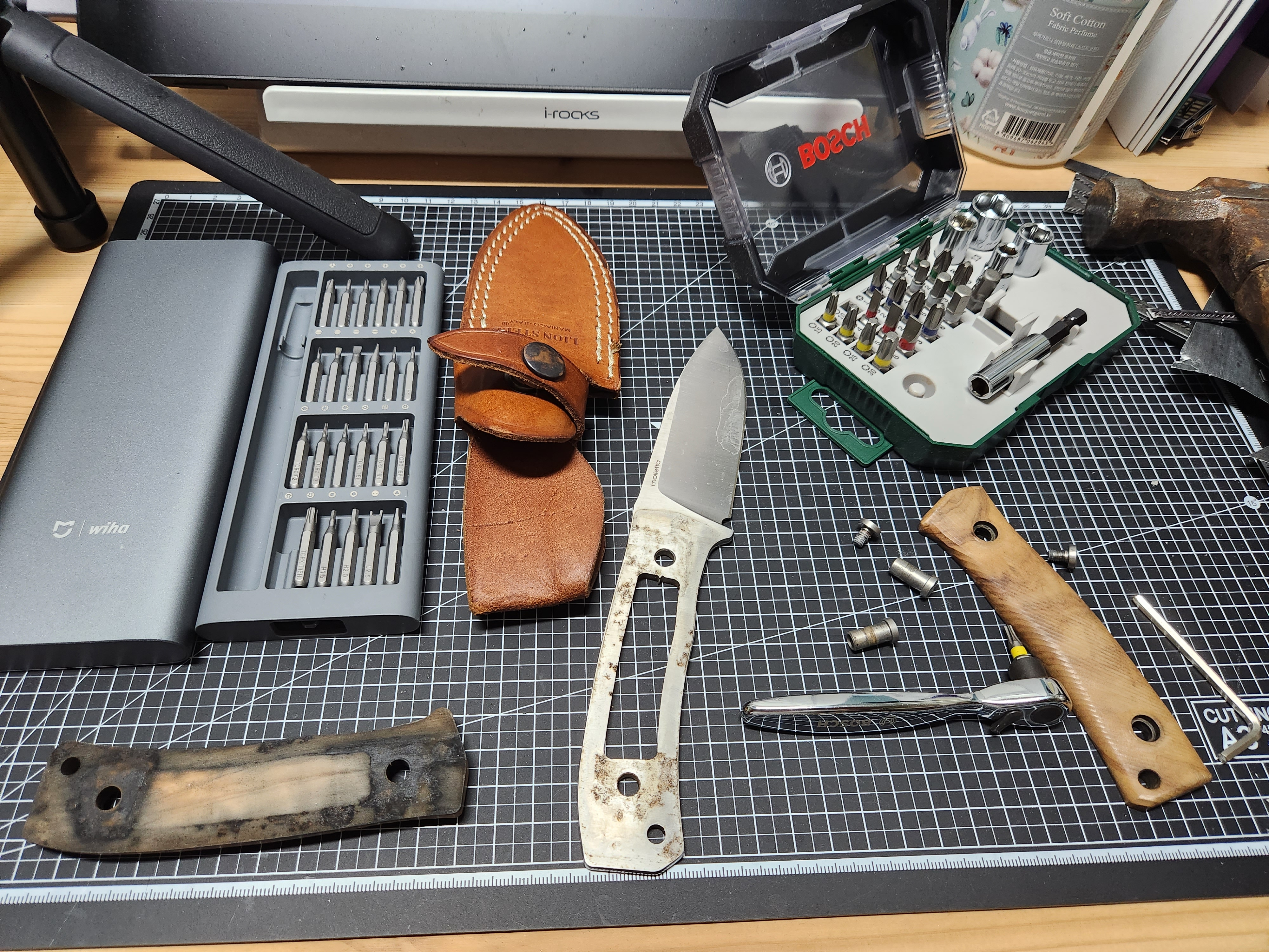 칼을 손질하기 위해 도구를 꺼냈다. 칼 손잡이에 달린 나사는 별모양 나사라 보쉬 미니 라쳇툴과 샤오미 드라이버셋을 이용하여 양쪽으로 돌려 분해했다.