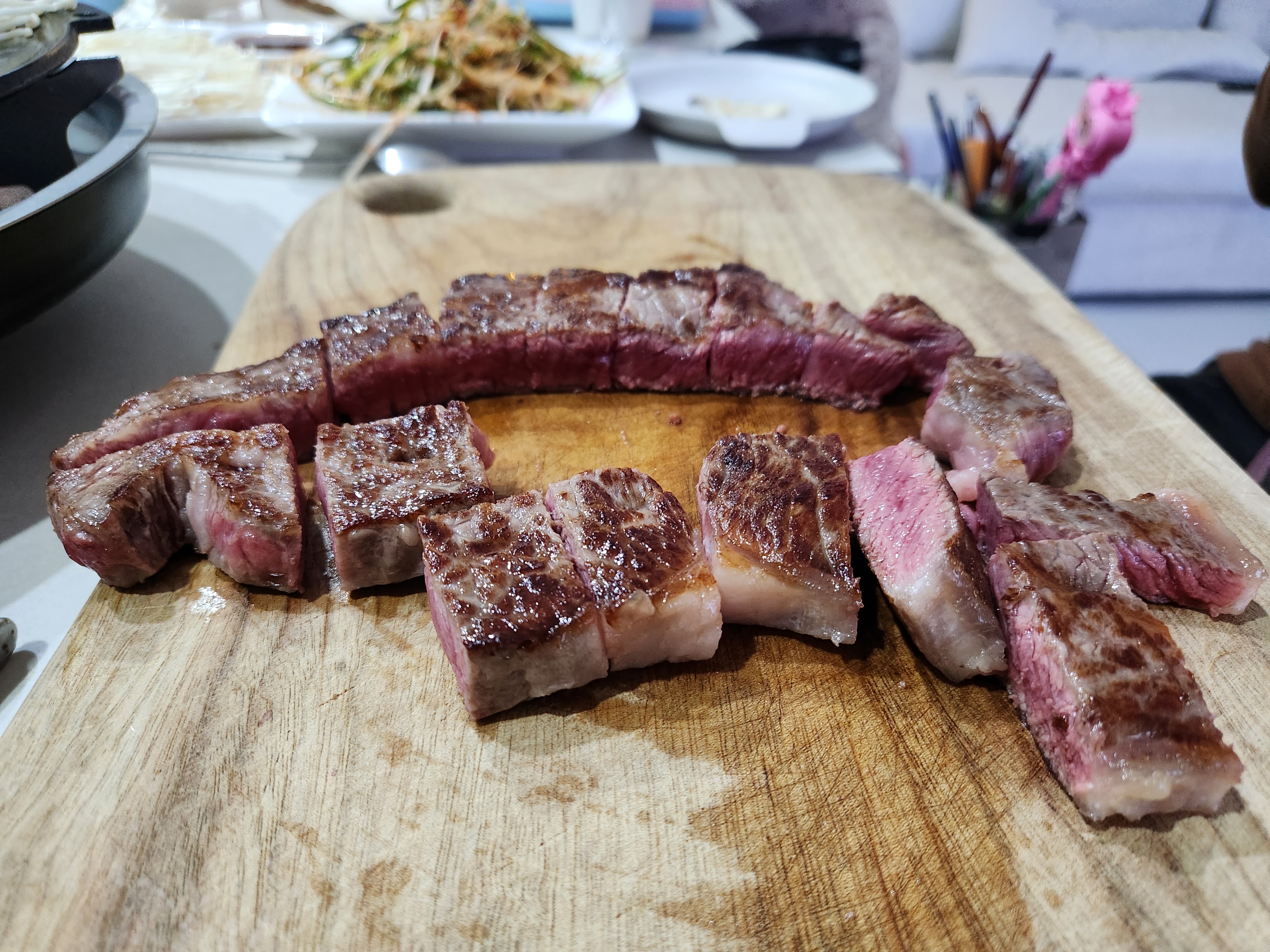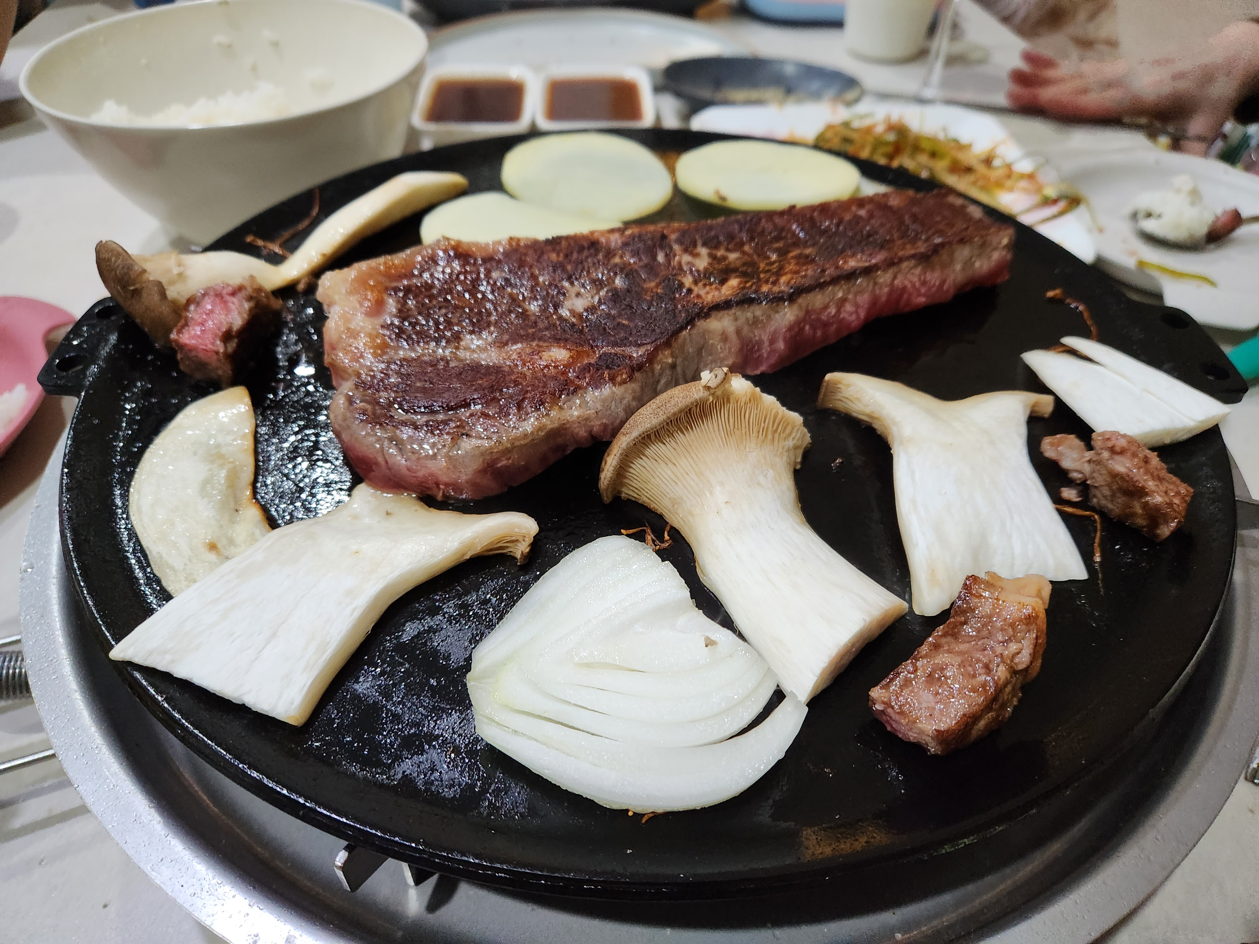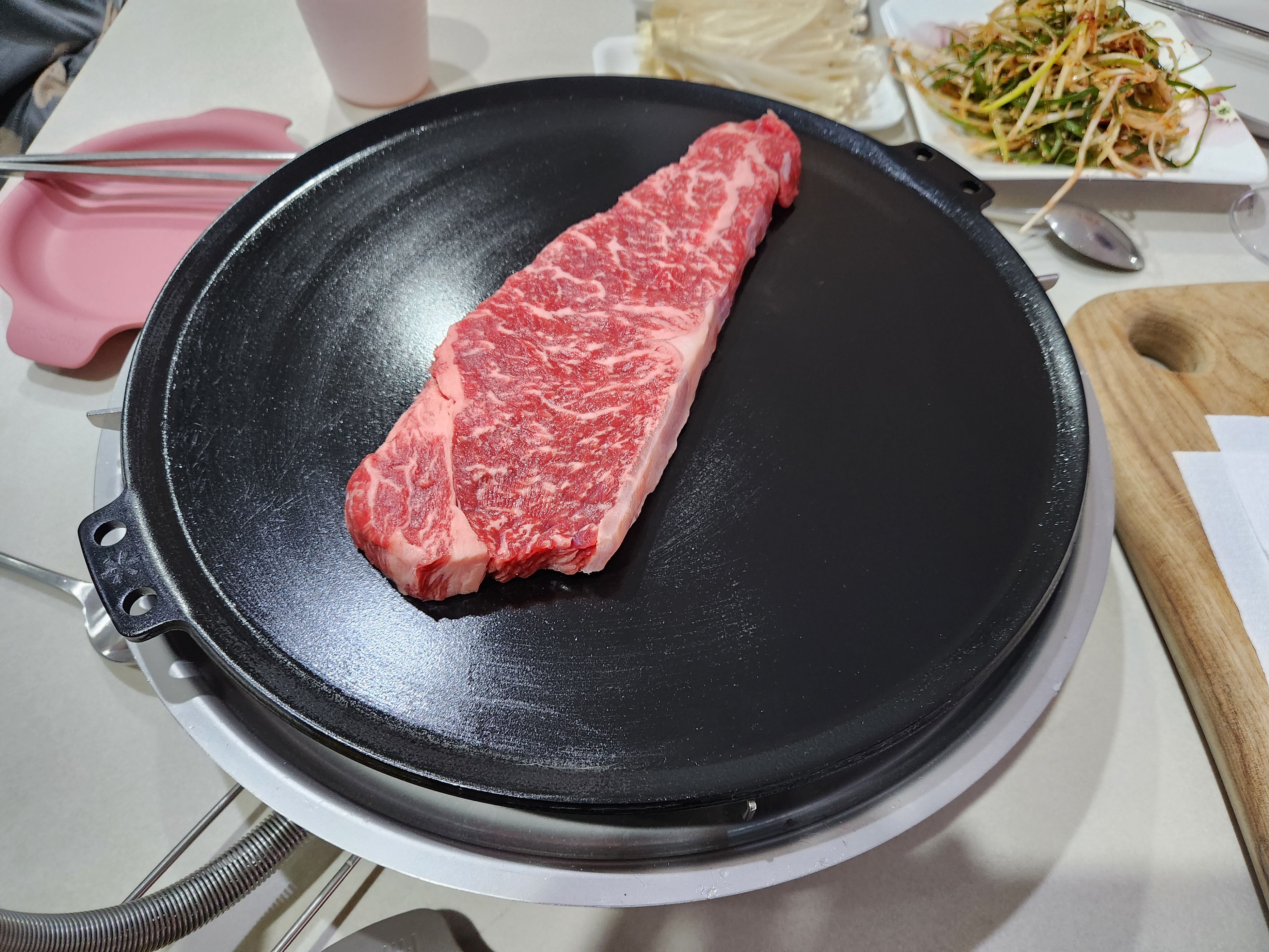 화력이 너무 셌는지 겉이 마이아르반응에 비해 안쪽이 덜익었다. 원래 한우는 덜익혀먹는 스타일이라 레스팅을 한 후에 먹으면 괜찮을것 같아 레스팅을 하고 먹었다.