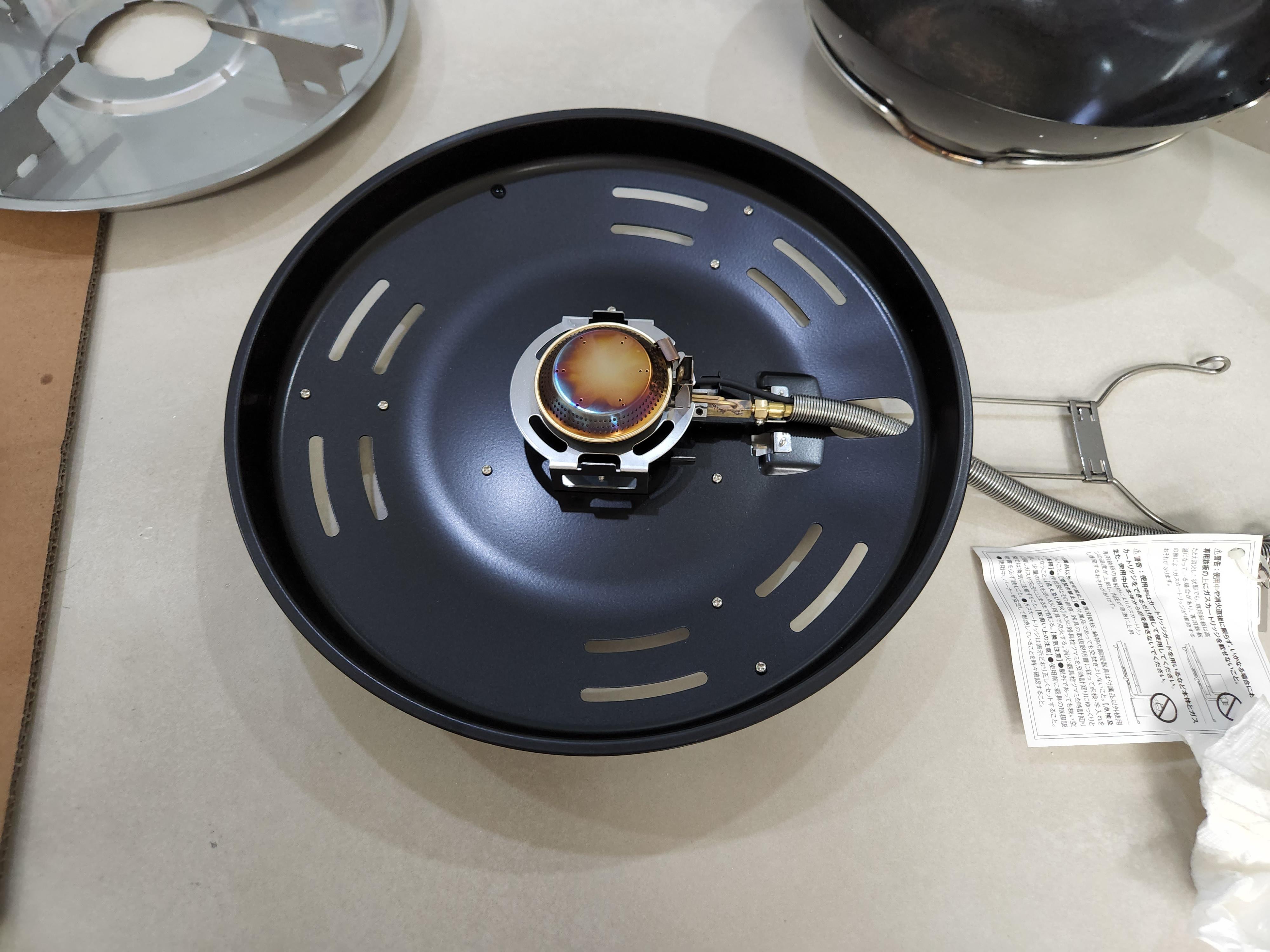카엔냄비와 조합한 모습. 웍은 구조상 험하게 다뤄줘야하는데, 웍질 같은것을 하면 밑에 받침대가 같이 흔들린다.