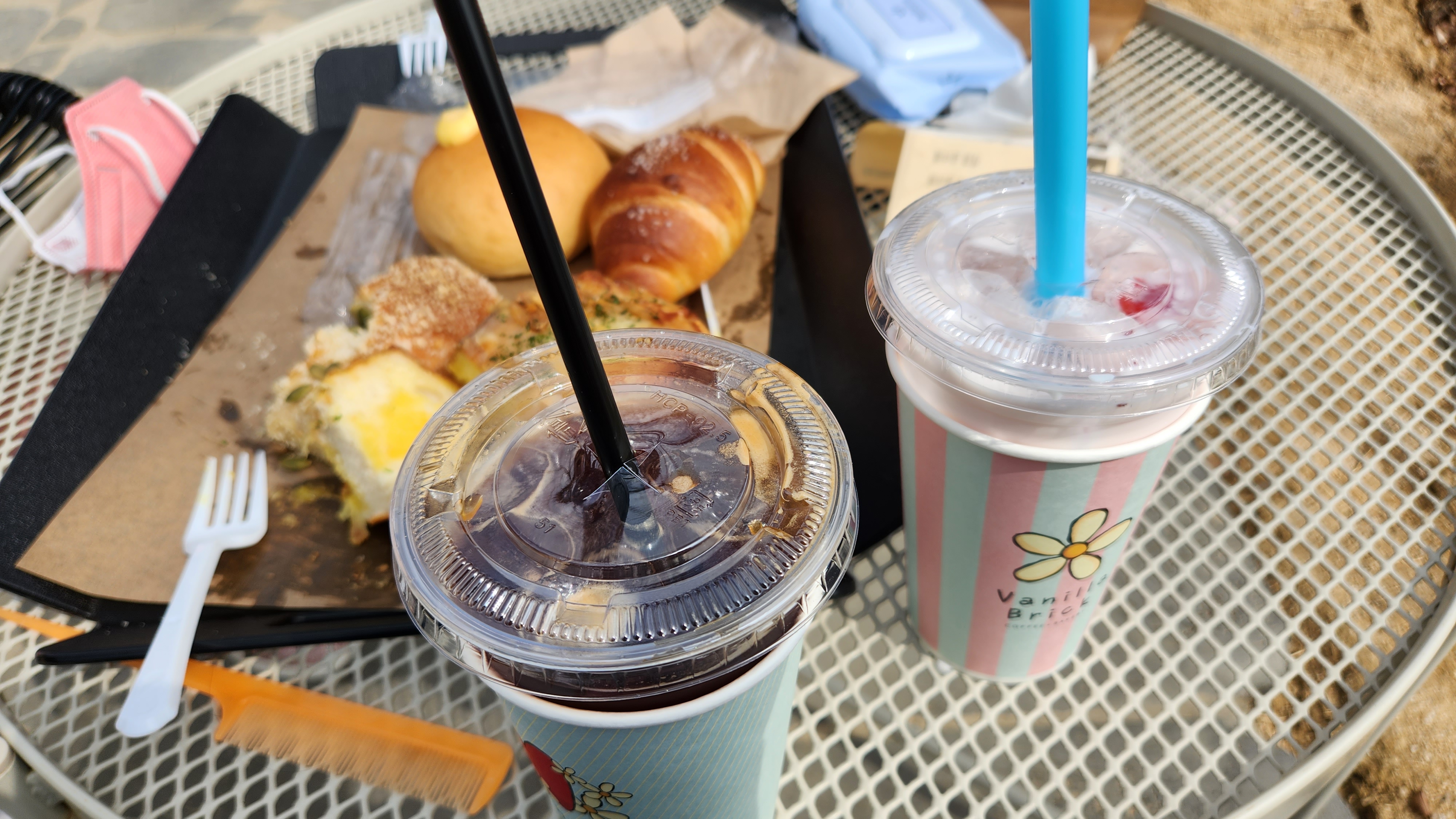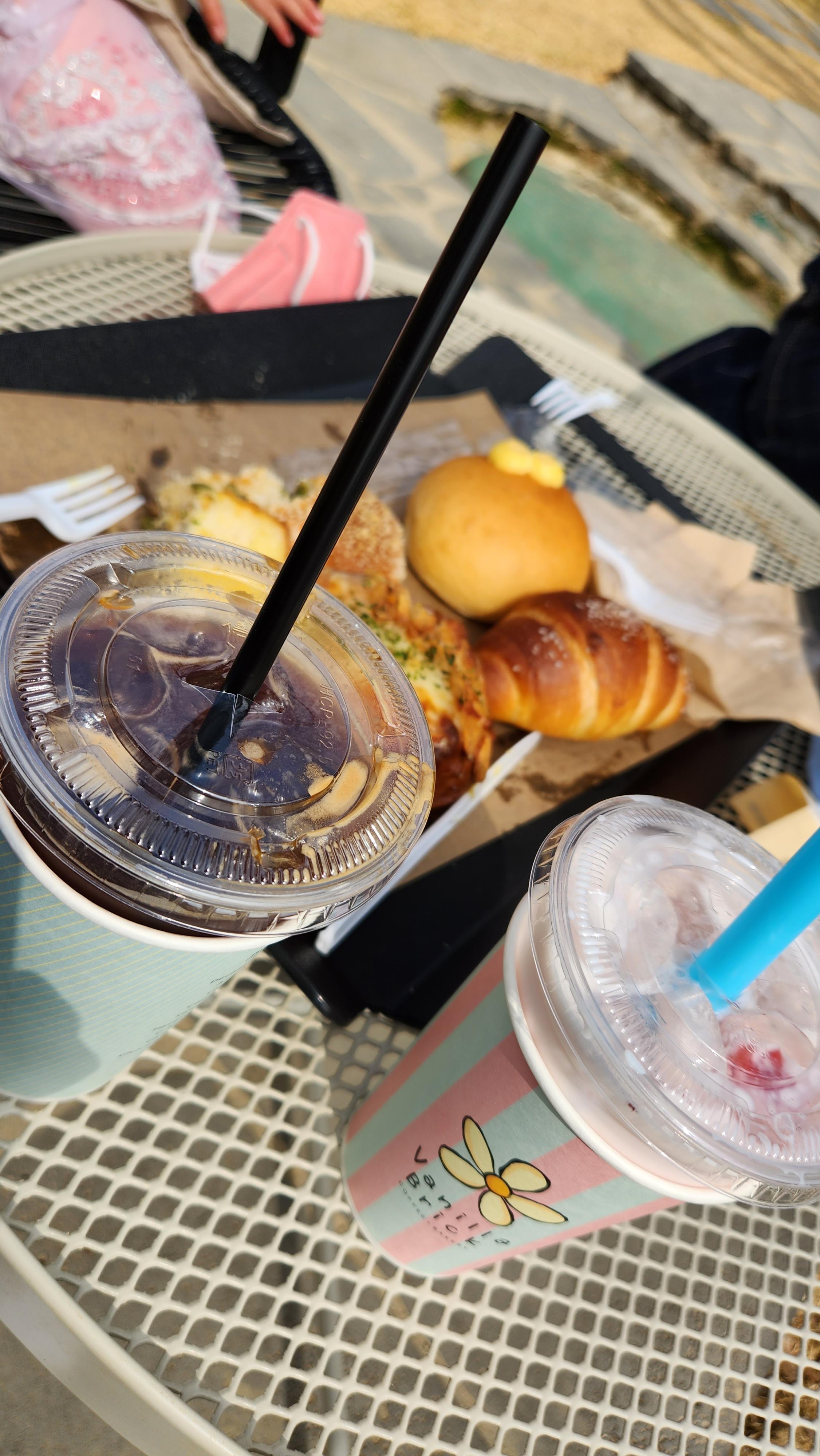 커피, 딸기 주스를 시켜다가 야외 테이블에서 먹었다.