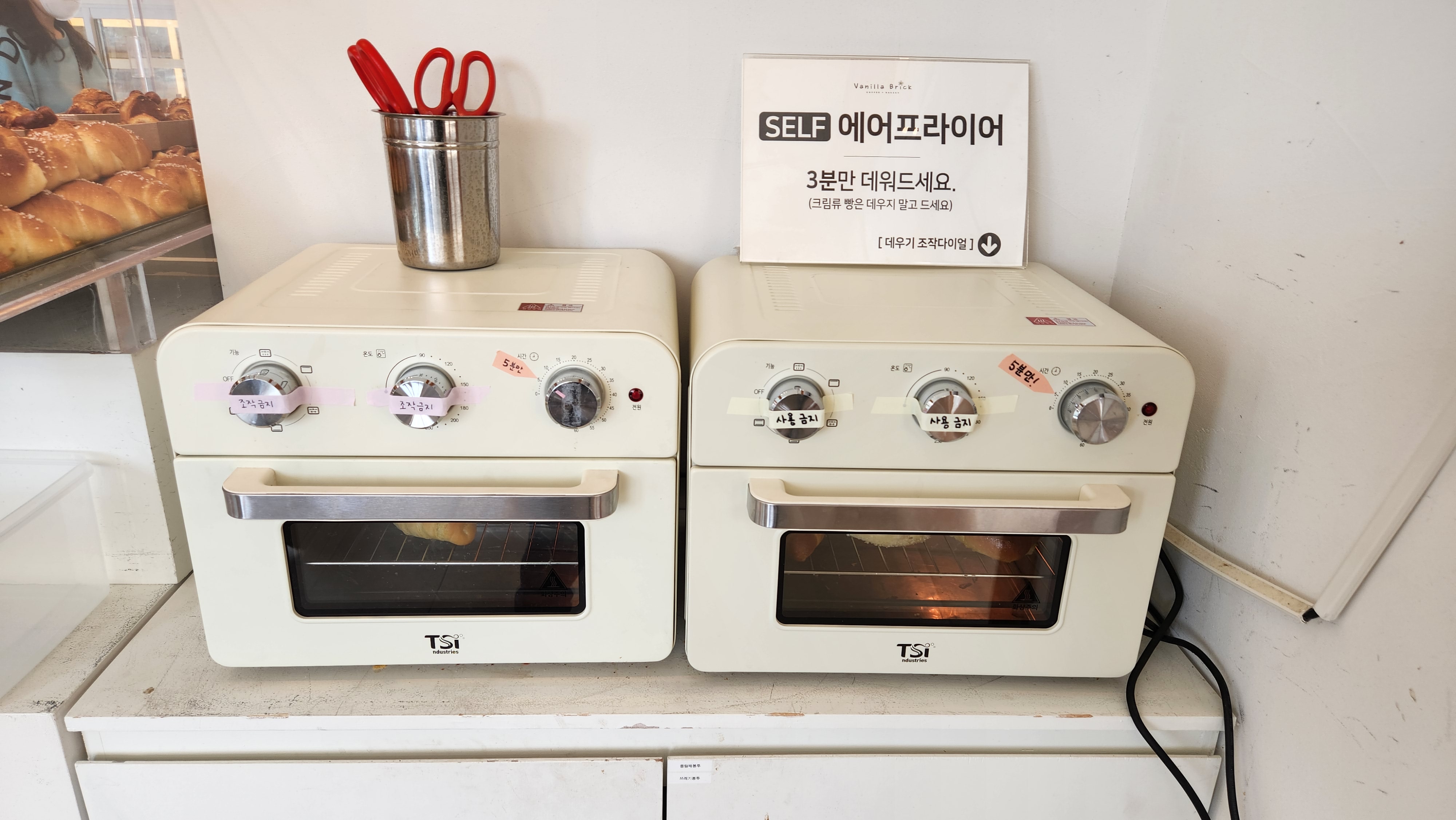 출입문 쪽에 빵 집게랑 트레이가 놓여 있다.