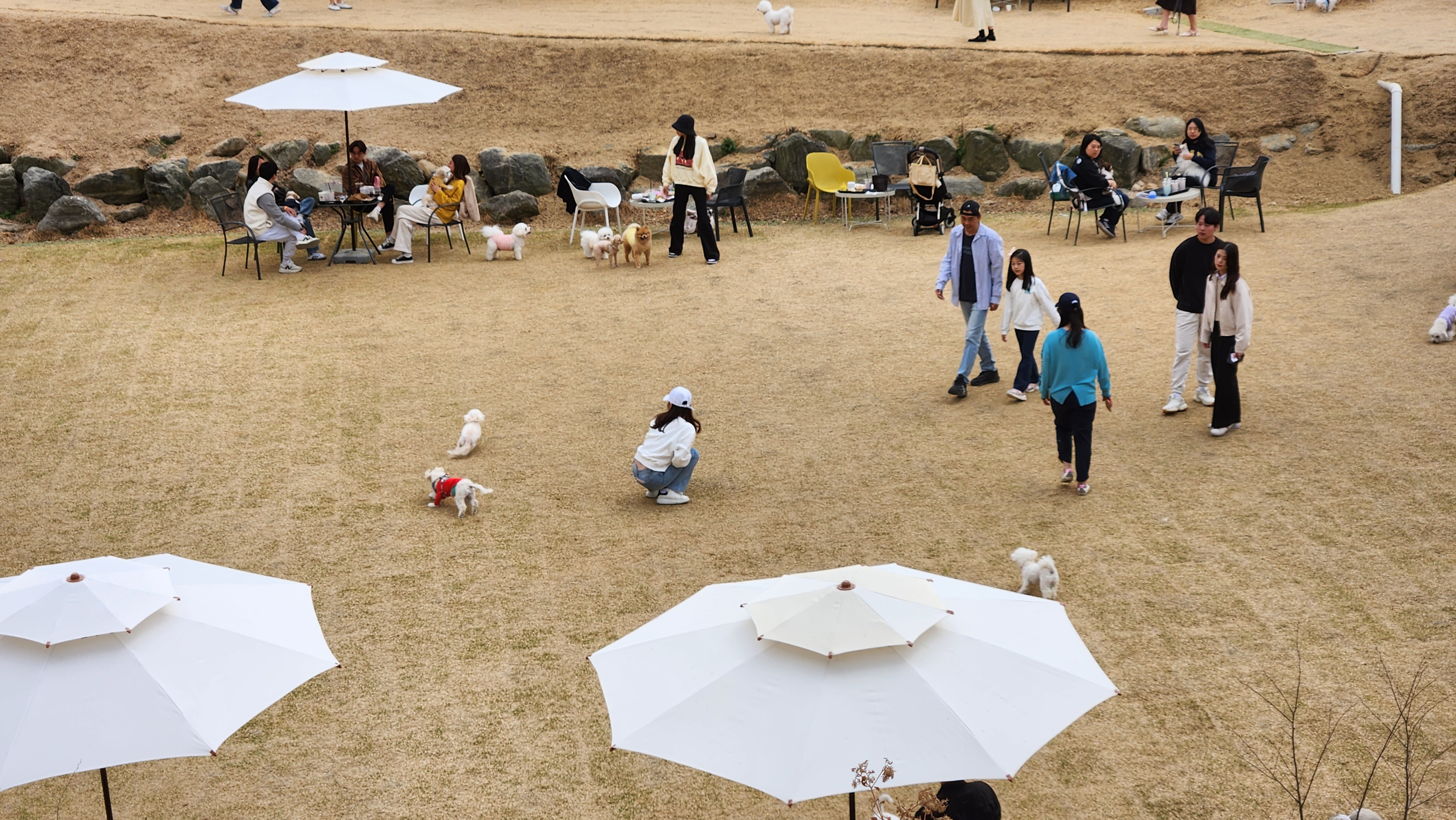 모두 애견을 데리고 와서 풀어놓고 야외에서 자연을 즐기고 있었다.