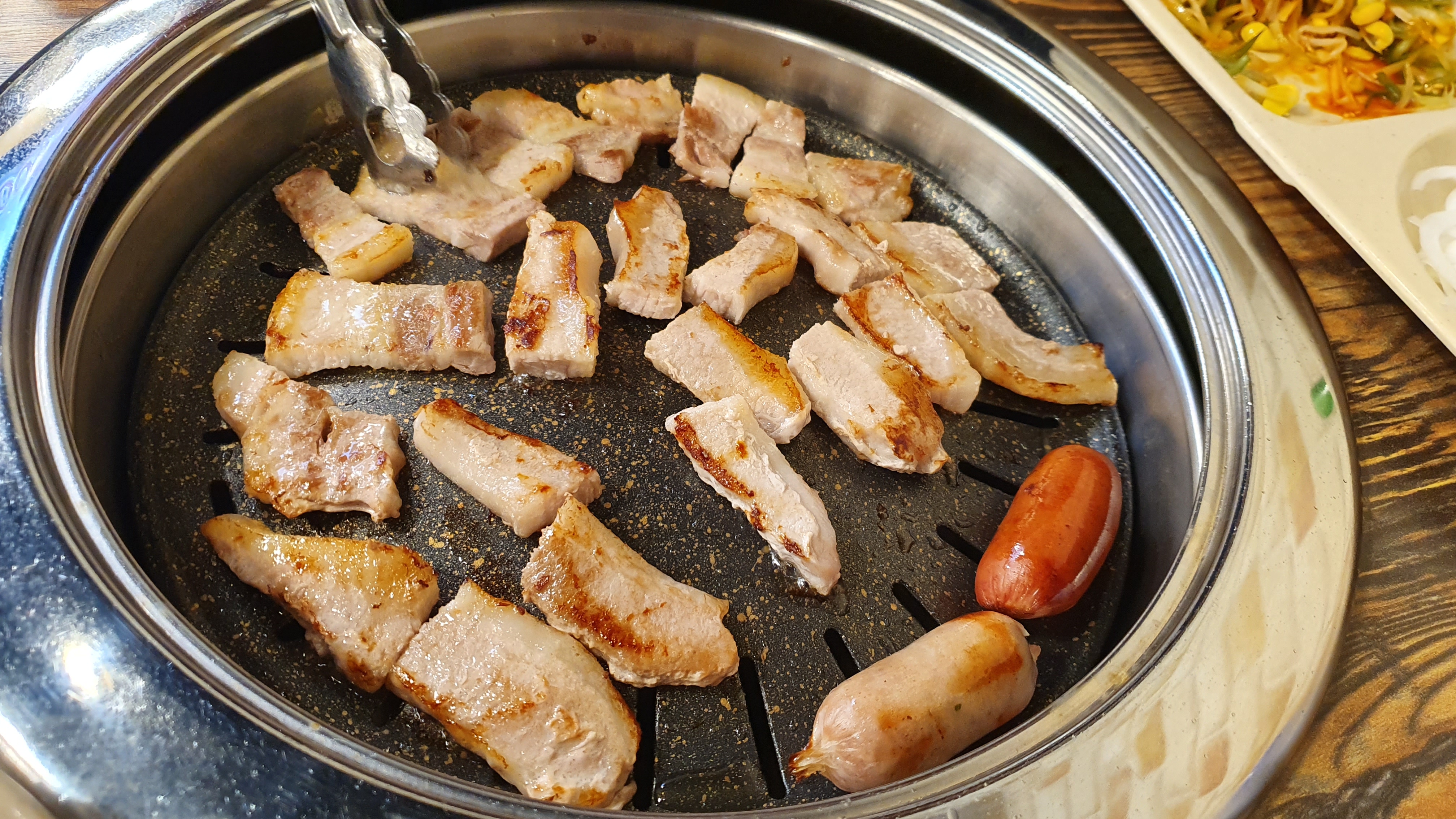 항정살과 삼겹살, 소세지를 구워 먹어 봅시다.