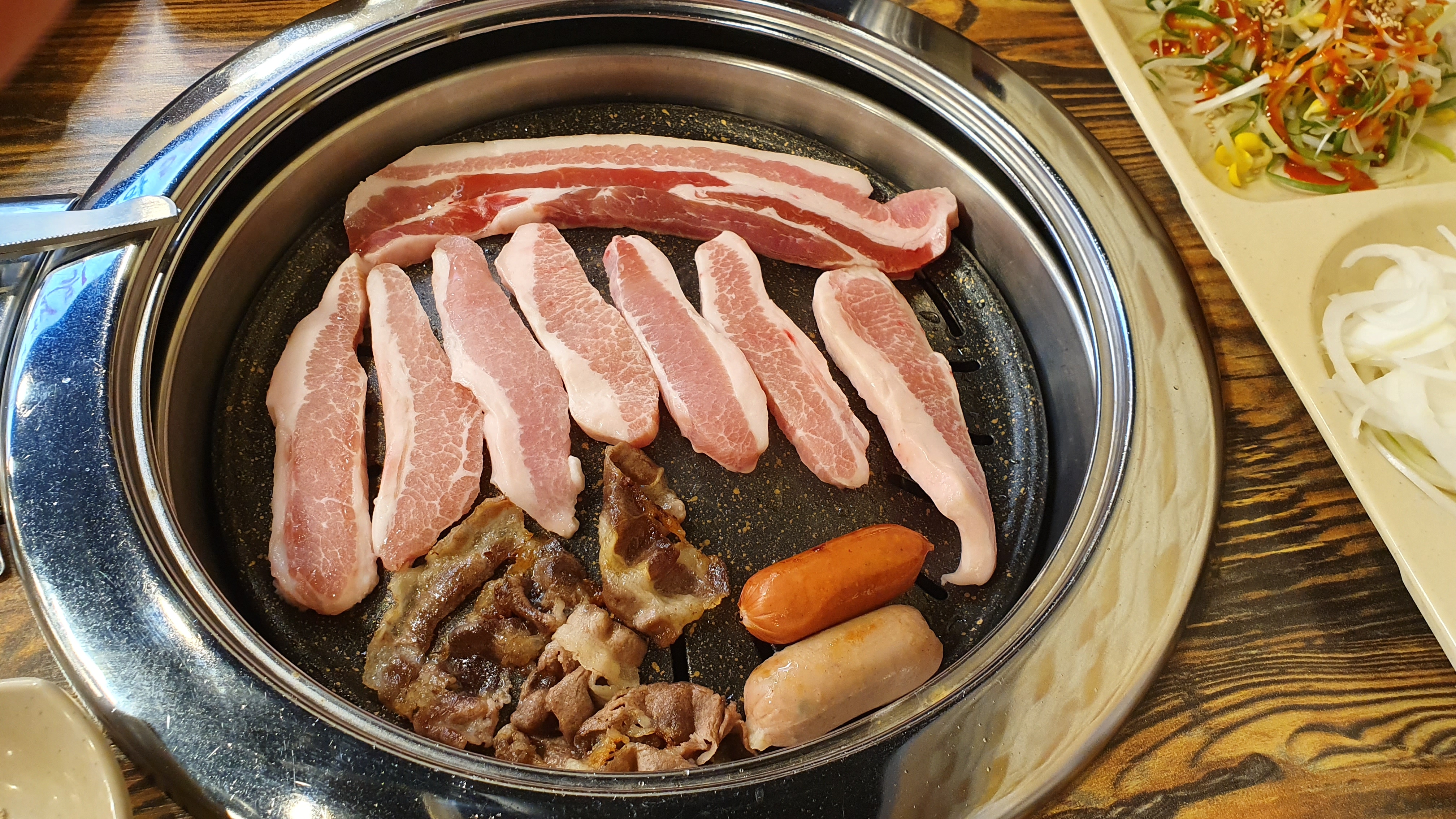 삼겹살 + 항정살 + 소세지 + 닭갈비 + 돼지갈비 등이 기본으로 준비 됩니다.